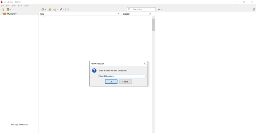 Choose a name for your collection that relates to your project, article, dissertation, or whatever you’re working on. For example, in this case, they chose