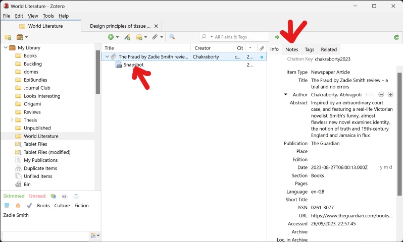 - You can check your Zotero library to confirm that it’s been added with all the details. You can also access it in the right-side panel for taking notes.