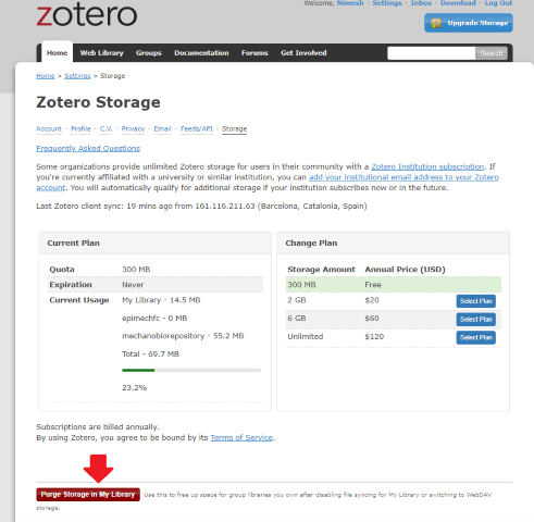 - You can check how much data you are using by going to “zotero.org,” logging in, and accessing your storage settings.