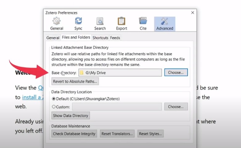 - In Zotero, go to “Preferences” > “Advanced” > “Files and Folders.”